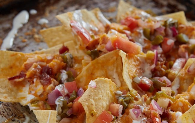Nachos with smoked chicken,beans shredded cheese,and pico!!! served with salsa and sour cream