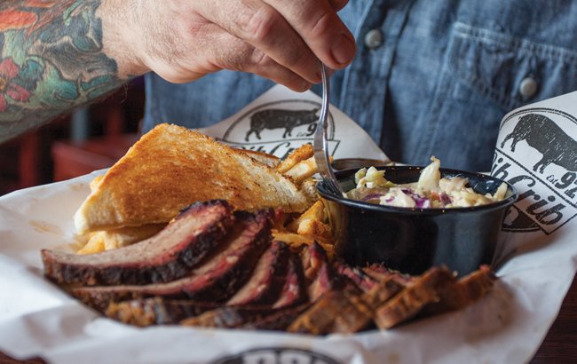 Sliced chicken breast, chopped brisket, pulled pork, sliced hot link served with 2 sides, Texas toast, and a pickle.